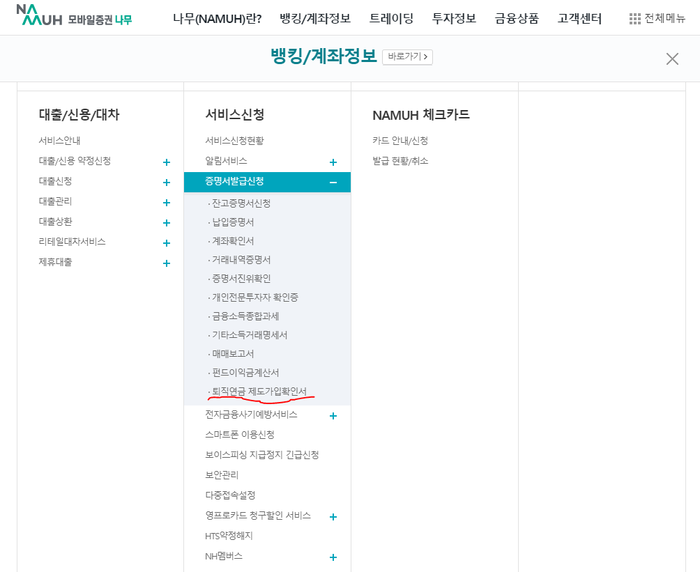로그인 후 뱅킹/계좌정보 > 서비스 신청 > 증명서발급 > 퇴직연금 제도가입확인서 로 들어갑니다.