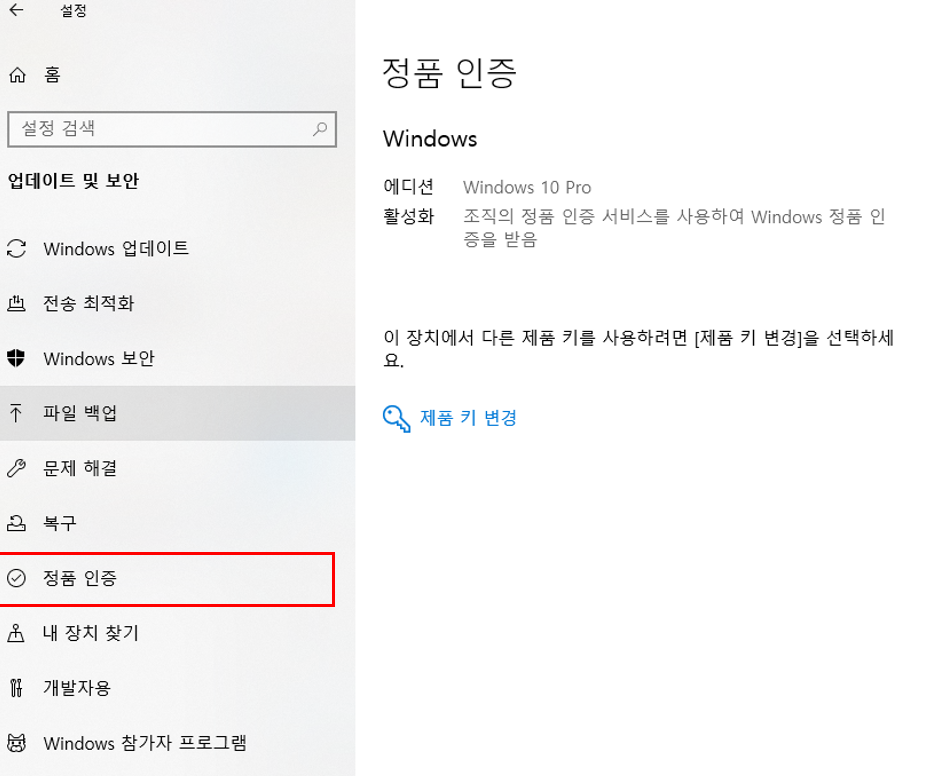설정으로 들어가 업데이트 및 보안 탭에서 정품인증을 확인해보면 정품인증된 제품이라고 나옵니다.