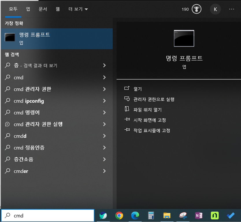 1. 윈도우 검색에 명령프롬프트 'cmd'를 검색하여 실행합니다.
