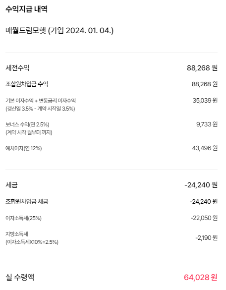 매월드림모햇이 1년으로 가장 짧은 상품이고 매월 드림모햇 Plus는 3년, 매월드림모햇 V+는 5년간 투자되는 상품입니다. 투자기간이 길수록 보장되는 이율은 높아지지만 오랜기간 목돈이 묶이는 단점이 있습니다. 저는 매월드림모햇으로 1년간 투자를 진행했고 그 성과를 확인해보겠습니다.